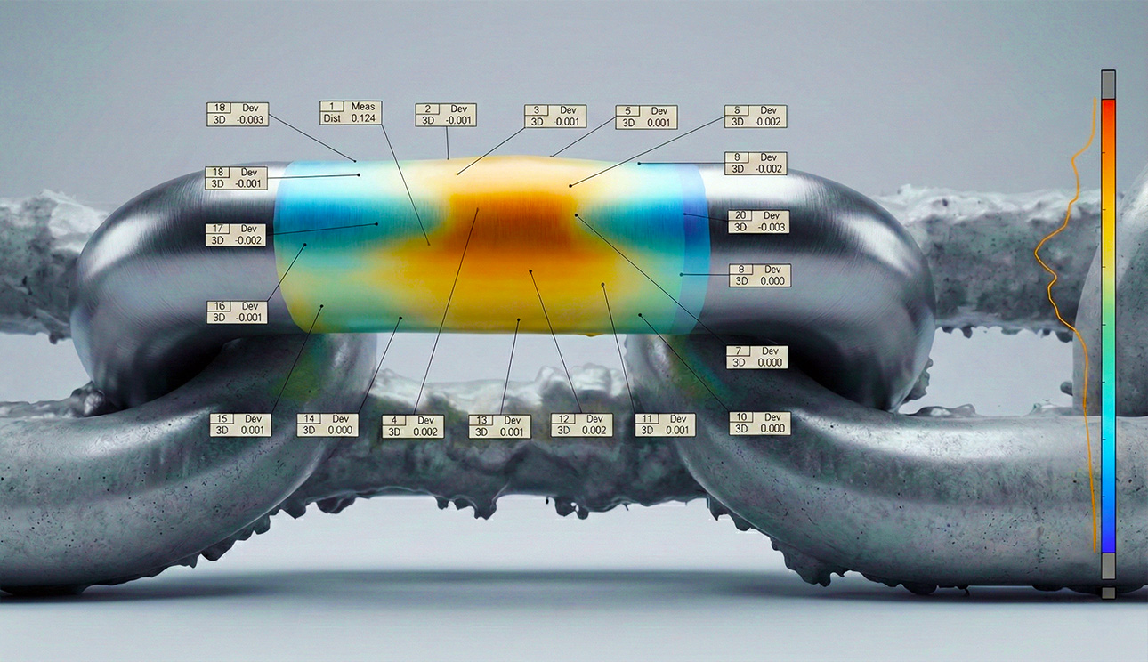 High-quality image acquisition in challenging subsea conditions enables the creation of a dense 3D Digital Twin. This digital representation allows accurate diameter measurements, surface irregularity detection, and direct comparison between the actual geometry and the theoretical chain model.